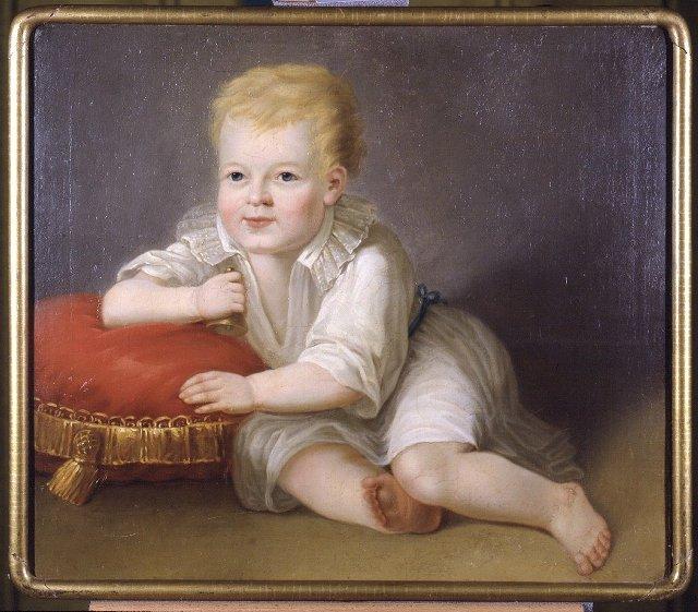 Puoliksi makuuasennossa olevan pikkupojan kokovartalokuva. Pellavankeltaiset hiukset, siniset silmät. Mekkomainen paita, jossa v-muotoinen kaula-aukko. Valkoinen laskostettu kaulus, sininen nauha vyötäröllä. Laspi nojaa vasten kuvan vasemmassa reunassa olevaa punaista tyynyä, jossa kullanvärinen nauha ja tupsu. Oikeassa kädessä kullanvärinen helistin. Tausta alhaalla vaaleanruskea, ylempänä harmaa. Myöhäinen kapea, pyöreä, kullattu kehys.