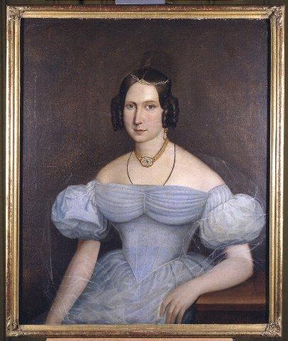 Istuvan naisen polvikuva vasemmalle, katse eteen. Tummanruskeat sivuille kammatut hiukset, ohimoilla korkkiruuvikiharat; harmaansiniset silmät. Vaaleansininen puku, kaula-aukko ulottuu olkapäille, rinnan kohdalta vaakasuuntaan laskostettu, lyhyet pussihihat. Hartioiden ympärillä ohut harso. Kaulassa leveä kullanvärinen kaulakoru, johon on upotettu kookas kivi; kapea, musta kaulanauha laitettu kaula-aukon sisään. Korvissa suuret pisaranmuotoiset helmet, päälaella kaksi toistensa ympäri kierrettyä helminauhaa. Vasen käsivarsi lepää ruskean pöydänkulman päällä. Tummanruskea tausta. Kapea, profiloitu, kullattu, kulmista koristeltu kehys.