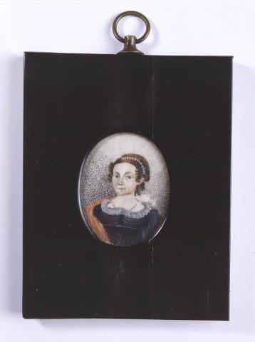 Rintakuva en face. Ruskeat kiharat hiukset. Musta empire-puku, jonka avaran pääntien ympärillä pitsinen(?) kaulus. Punainen hartiahuivi. Hiuksissa ja kaulassa helminauha. Tausta harmaa, pisteinen. Kehys nelikulmainen, mustaksi maalattu.