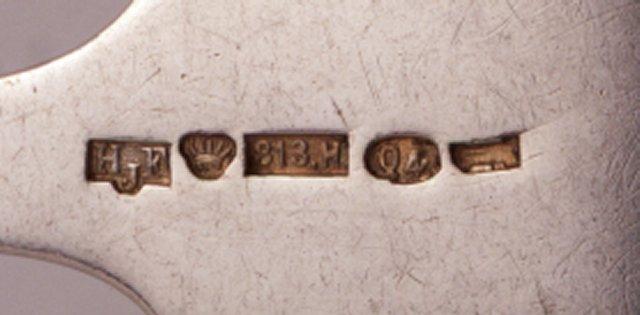 Osan mitat: halkaisija 5.00 cm; Nimikirjaimet: M.M; Leima: HjF; kruunu; 813H; Q4; vene; Tyyli: uusrokokoo; Merkinnän kuvaus: kaunokirjoituskirjaimin; suorakaiteessa; Kirjallisuus: Raimo Fagerström, Suomalaista hopeaa. Helsinki 1983. Leima nro 99.; Merkintätekniikka: kaiverrus; Osa: pesä