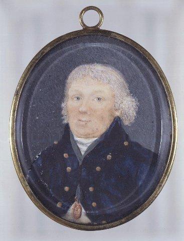 Soikea miniatyyri. Keski-ikäisen miehen rintakuva, vartalo vasemmalle. Ohuet harmaanvalkeat hiukset, siniharmaat silmät. Musta takki jossa kullanväriset napit, valkoinen liivi ja huivi. Kaulassa harmaanvihreässä nauhassa Vaasa-ritarikunnan merkki. Siniharmaa tausta. Kapea kullattu kehys. Ripustuslenkki. Lasi.