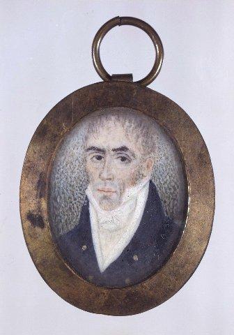 Soikea miniatyyri. Miehen rintakuva vasemmalle. Vaalea tukka, tummat kulmakarvat, poskiparta, parransänkeä. Tummansininen takki, valkoiset liivit ja kaulaliina, pystykaulus. Sinertävänharmaa tausta maalattu rakeiseksi. Kuvan päällä lasi. Kuparikehys jossa ripustuslenkki ja -rengas.