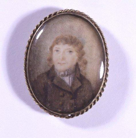 Soikea miniatyyri. Nuoren miehen rintakuva lähes suoraan edestä. Harmaat silmät, vaaleanruskeat kiharat hiukset. Ruskea takki, kaksirivinen napitus. Valkoinen, siniraitainen paita ja kaulaliina. Harmaa tausta. Hopeakehys, jonka reunassa koristeena kierrettyä hopeanauhaa. Takana rikkinäinen hakanen. Kuvapuolella kupera lasi.