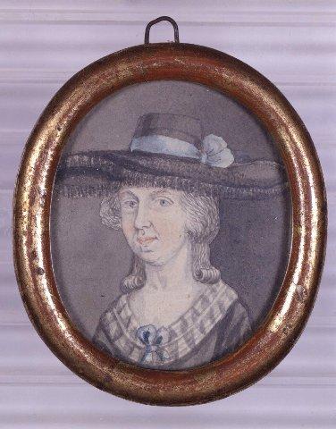 Soikea miniatyyri. Naisen rintakuva vasemmalle. Olkapäille kihartuvat hiukset. Avokaulainen harmaa puku, vaalensinisellä nauharuusukkeella koristeltu pyöreä, röyhelön reunustama kaulus. Tumma leveälierinen hattu, jossa on sininen nauha. Harmaa tausta. Pyöreäksi profiloitu puinen, kullattu kehys. Kultauksen alta näkyy punaista väriä. Ripustuslenkki. Maalauksen päällä lasi.
