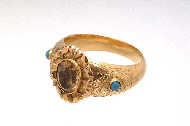 Sormus, kultaa, kannassa keltainen lasikivi rokokookehyksessä.