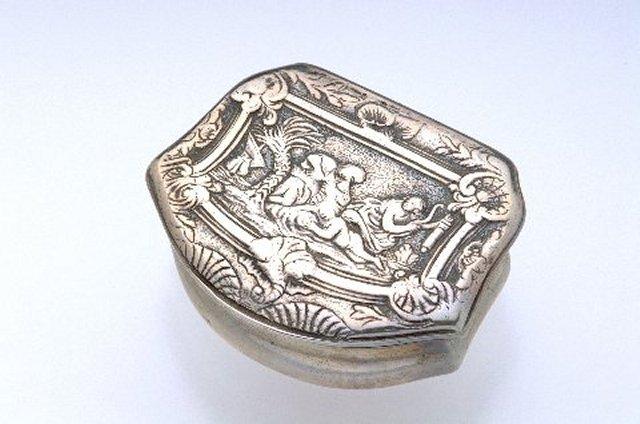 Hopearasia, kaarevat sivut, kannessa reliefikuvia, ei täysin määriteltyjä kulumisen vuoksi (useita hahmoja), simpukka- ja köynnöskehys samoin reliefinä. Mitat 6¼ x 5½ s 2½ cm.