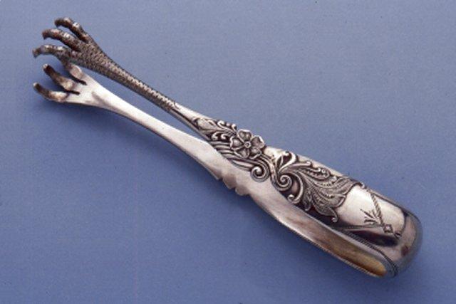 Varsi leveähkö, hiukan kupera, kaksinkerroin taivutettu. Pihtien päät linnun kynsien muotoiset. Varsissa kukkaornamentiikkaa kohokuvioisena sekä kaiverrettua nauhaornamentiikkaa varren taivutetussa osassa.