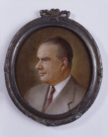 Keski-ikäisen miehen rintakuva vasemmalle, lähes profiilista. Harmaantuneet taaksepäin kammatut hiukset, tuuheat kulmakarvat. Vaaleanharmaa puvuntakki, valkoinen paita, punainen solmio, solmiossa helmineula. Ruskea tausta. Maalattu soikealle posliinilevylle. Koristeellinen tinakehys.