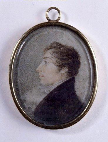 Nuorehkon miehen rintakuva profiilista vasemmalle. Ruskeat, eteenpäin kammatut hiukset, harmaat silmät. Musta takki, valkoinen liivi ja kaulaliina. Harmaa tausta. Ohut kullattu metallikehys, ripustuslenkki.