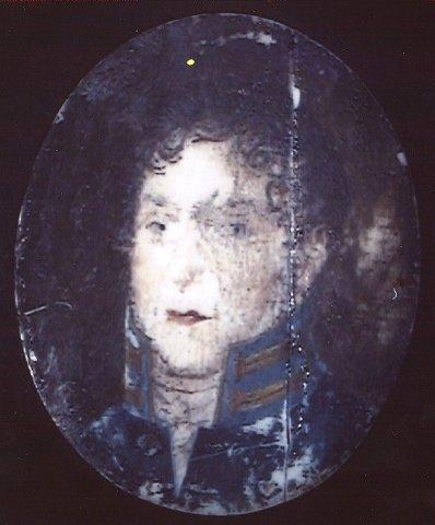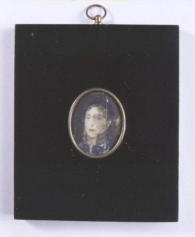 Soikea miniatyyri. Nuorehkon miehen kasvokuva vasemmalle. Harmaat silmät, mustat eteenpäin kammatut hiukset. Kalpea iho, väri ihan kohdalta kulunut. Sininen univormu, jossa hieman vaaleamman sininen kaulus. Kauluksessa kultakaluunat. Mustanharmaa tausta. Kapea kullattu metallikehys kuvan ympärillä. Suorakulmainen musta puukehys jossa ripustusrengas.