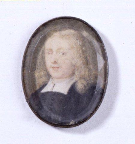 Miehen rintakuva hieman vasemmalle. Vaaleanruskeat olkapäille ulottuvat hiukset, ohuet viikset. Oikea silmä samea (sokea). Musta takki, leveä valkoinen papinkaulus. Harmaa tausta. Kapea teräskehys. Kuvan päällä reunoista fasetoitu paksu lasi.