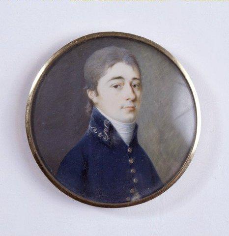 Nuoren miehen rintakuva hieman oikealle, katse eteen. Harmaat hiukset, ruskeat silmät. Sininen univormu, valkoinen liivi ja valkoinen kaulaliina. Takissa kaulus kultakirjailtu. Tausta harmaanvihreä. Kapea kultainen kehys. Kuvan päällä ja kääntöpuolella kupera lasi. Kääntöpuolella lasin alla valkoisen silkin päällä vaaleanruksea hiuskiehkura ja pieni lemmikinmallinen emalioitu koristeneula.