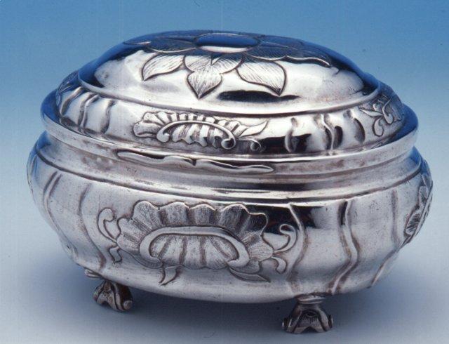 Soikea, pullea, jalallinen, pakotekuvioin koristettu rasia. Reunassa on edessä, takana ja kummallakin sivulla rocaillekuvio, sivuilla olevissa kuvioissa on keskellä ristikkoaiheista kaiverruskoristelua. Rocaillekuvioiden välissä, rasian jalkojen kohdalla, kolme loivasti kaartuvaa pakotekuviota, joista keskimmäinen on kohouma- ja reunimmaiset painannekuvioita. Alaosassa on kannen alapuolella kourumainen sileä rengas, jonka alapuolella on kapea pakotettu kohoumarengas. Kannen keskellä on pitkulainen tyylitelty kukkakuvio; tämän ympärillä vyöhyke, jossa edessä takana ja kummallakin sivulla rocaillekuvio ja näiden välissä, rasian jalkojen kohdalla samanlaiset kaartuvat kuviot kuin rasian alaosassakin. Kannen reuna sileä, alaosan suoran reunan päälle ulottuva. Rasiassa kaksihaaraiset voluuttijalat, joissa kolmiomainen kiinnikeosa. Sulkemista varten on rasian edessä kaarevareunainen tukeva uloke.