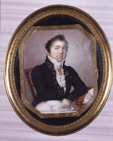Keski-ikäisen istuvan miehen puolivartalokuva. Vartalo oikealle, kasvot eteenpäin. Tummat, lyhyet eteenpäin kammatut hiukset, ruskeat silmät. Siviiliunivormu, jossa musta korkeakauluksinen takki, kauluksessa ja hihansuissa kultakirjontaa, kullanväriset napit. Valkoiset housut, liivi, paita ja kaularöyhelö. Pyhän Annan ritarikunnan kaularisti, kolme pienempää kunniamerkkiä rinnassa. Oikea käsi työnnetty takin sisään, vasen käsi nojaa pöytään ja pitelee kirjettä. Vasemman käden keskisormessa suurikokoinen kantasormus. Tuoli ja pöytä ruskeita, pöydällä kirjeitä ja sinetöityjä kirjekuoria. Harmaa tausta. Soikea messinkikehys. Miniatyyrin kuva-ala kahdeksankulmainen, kullanvärisellä paperilla reunustettu. Kuvan ja kehyksen väliin jäävä alue on musta. Messinkikehyksessä kaiverruskoristelua.