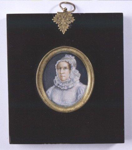Hieman oikealle kääntyneen keski-ikäisen naisen rintakuva. Ruskeat hiukset, siniset silmät. Valkoinen puku ja myssy, kaksinkertainen pitsikaulus. Harmaa tausta. Kuvan ympärillä messinkikehys. Lakattu suorakulmainen puukehys jonka yläreunassa koristeellinen, lehdenmuotoinen messinkiripustin. Miniatyyrin suojana lasi. Kääntöpuolella muovilevy.