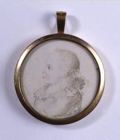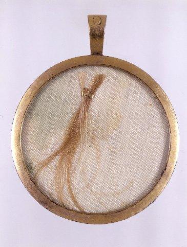 Lapsen rintakuva profiilissa vasemmalle. Puvussa röyhelökaulus. Mustavalkoinen lukuunottamatta kevyesti punattuja poskia ja huulia sekä sinisiä silmiä. Lasi. Kultakehys jossa ripustuslenkki. Kääntöpuolella lasin alla vaalealla silkillä vaalea hiuskiehkura.