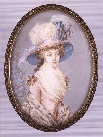 Oikealle kääntyneen naisen puolivartalokuva. Ruskeat silmät, ruskeat kiharat hiukset. Suurikokoinen, leveälierinen sinisellä kankaalla vuorattu vaalea hattu, jossa sininen töyhtökoriste. Vaaleanpunainen puku, jossa valkoinen pöyheä kaulahuivi ja rusetit olkapäillä. Käsivarsilla vaalea pinikuvioinen hartiahuivi. Taustana sininen taivas, vasemmassa reunassa pensas jossa sinisiä kukkia. Kapea, helmisauvalla koristettu messinkikehys.