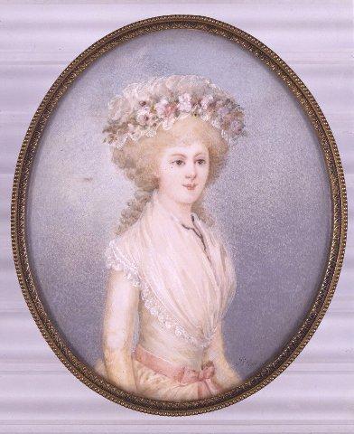 Nuoren, hieman oikealle kääntyneen naisen puolivartalokuva. Vaaleat kiharat hiukset, ruskeat silmät. Korkean kampauksen päällä ohuesta kankaasta tehty valkoinen myssy ja kukkaseppele. Vaaleankeltainen puku, kaulassa ohuesta valkoisesta kankaasta tehty pitsireunainen huivi. Vyötäröllä punainen nauha joka on edestä rusetilla. Kaulassa musta nauha. Sininen tausta. Kapea messinkikehys.
