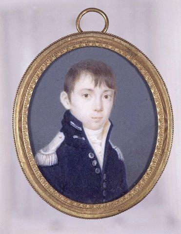 Painokuva: nuoren miehen/pojan rintakuva hieman oikealle. Ruskeat hiukset ja silmät. Tummansininen korkeakauluksinen univormun takki, jossa hopeiset napit ja kaluunat. Valkoinen paita ja liivit. Sininen tausta. Ohuesta messinkilevystä prässätty koristeellinen kehys, jossa ripustuslenkki. Kääntöpuolella tummanruskea vinoruutukuvioiseksi prässätty paperi.