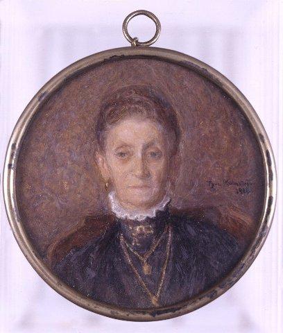 Vanhan naisen rintakuva en face, ruskea ylöskammattu hiuslaite, yllä musta korkeakauluksinen puku, kaulassa valkea röyhelö, kultaiset korvakorut, rintaneula ja kaksi kaulaketjua. Tausta ruskea. Kapea kultakehys.