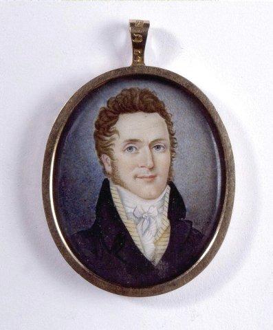 Rintakuva hieman oikealle kääntyneestä nuorehkosta miehestä. Vaaleanruskeat hiukset, poskiparta. Siniaharmaat silmät. Musta takki, keltainen, vaakaraidallinen liivi. Valkoinen korkeakauluksinen paita, kaulaliina ja röyhelö. Harmaa tausta. Kapea, sileä kultakehys. Ripustuslenkki, miniatyyrin ja kääntöpuolen päällä lasi. Kääntöpuolella silkille maalattuna kuva puuryhmästä, jonka edessä on muistokivi. Kiven vasemmalla puolella on amoriini, kiven päällä kaksi liekehtivää sydäntä, joiden yläpuolella lentää kaksi kyyhkystä. Kivessä teksti: Oföränderlige och Oskiljagtige.