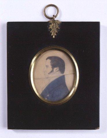Miehen rintakuva profiilissa vasemmalle. Tummat hiukset, poskiparta. Sininen takki ja valkoinen, pystykauluksinen paita. Vaalea tausta. Kuvan ympärillä metallireunus, suorakaiteen muotoinen mustaksi maalattu puukehys, jossa metallinen (messinkinen?) tähdenmallinen ripustuslenkki sekä ripustusrengas.
