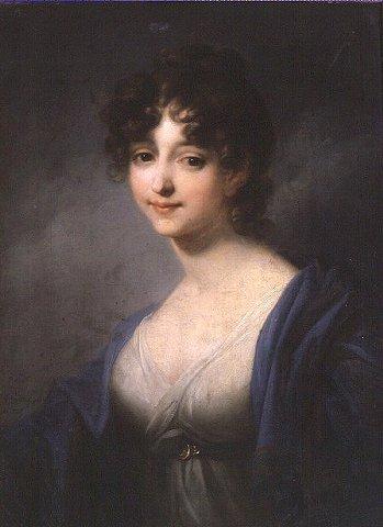 Naisen rintakuva, puoliprofiili vasemmalle, katse eteen. Ruskeat kiharat hiukset, ruskeat silmät, hymyilee. Yllä vaalea avokaulainen empirepuku, vyössä koristeellinen solki. Hartioilla sininen huivi, jonka päässä punaisia ja vihreitä raitoja. Tausta tummanharmahtava. Kullattu kehys jossa kasviaiheisia kipsikoristeita.