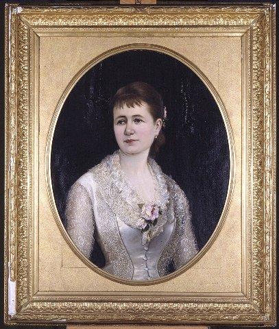 Naisen rintakuva, vartalo oikealle kääntynyt, kasvot vasemmalle. Siniset silmät, ruskeat nutturalle kootut hiukset, otsatukka. Valkoinen sillkipuku, jossa pitsihihat; pitsiä miehustassa ja kaula-aukon ympärillä; napitus edessä. Kaula-aukossa vaaleanpunainen ruusu. Helmikorvakorut. Tumma tausta. Suorakaiteen muotoinen, profiloitu, leveä kullattu kehys, jossa soikea kuva-aukko.