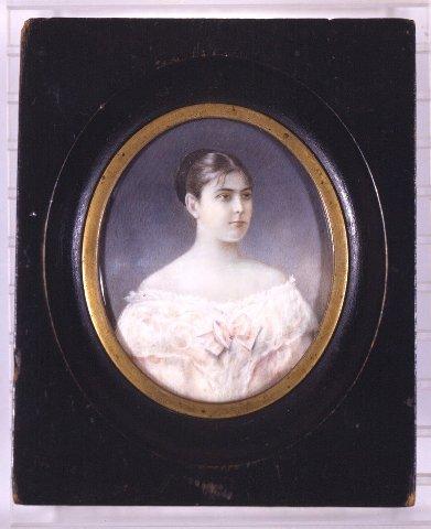Nuoren tytön rintakuva --->. Mustat hiukset kerätty takaraivolle, musta hiuspanta. Avokaulainen valkoinen ja vaaleanpunainen puku, rinnustassa rusetti. Tausta mustanharmaa. Suorakulmainen musta puukehys, jonka keskellä soikea syvennys, kuva-aukon reunassa kapea, sileä messinkireunus. Lasi, takana nojatuki.
