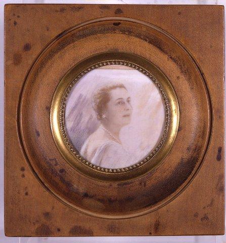 Keski-ikäisen naisen hartiakuva --->, kasvot oikealle ylös. Selästä avoin vaaleansininen puku, kaulassa helminauha, helmikorvakorut. Vaaleanruskeat lyhyet hiukset. Tausta vaaleansiniharmaa. Ruskea suorakulmainen puukehys, keskellä pyöreä syvennys, kuva-aukon reunassa kapea, kourumainen, sisäreunasta koristettu messinkireunus. Lasi. Takana nojatuki.