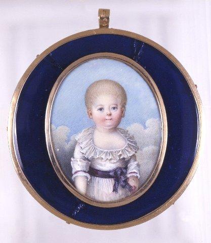 Kaksi muotokuvaminiatyyriä samaan kehykseen kiinnitettynä. a) Vara-amiraali C. O. Cronstedt (1756-1820), keski-ikäisen miehen rintakuva --->, katse eteen. Sininen univormu, jonka rinnuksessa miekkaritarikunnan merkki. Keltainen sinireunainen olkanauha, kaulassa kultakäädyt, joista roikkuu soikea medaljonki (Ruotsinsalmen taistelun muistomitali). Mustassa nauhassa Maltan ritarikunnan risti. Kaulassa musta liina. Harmaat hiukset. Tausta harmaanruskea. Päällä lasi. b) Edellisen tytär, Hedvig Charlotta Cronstedt (1795-1868) lapsena, puolivartalokuva. Valkoinen, röyhelökauluksinen puku, violetti vyö. Taustalla vaaleansinistä taivasta ja pilviä. Päällä lasi, ympärillä kapea kultakehys ja tummansinistä lasia oleva O:n muotoinen kehys. Koko miniatyyrin ympärillä kapea kultakehys. Ylhäällä ripustusrengas.