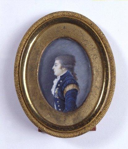 Nuori mies profiilista vasemmalta, puolivartalokuva. Tummansininen kansallinen ruotsalainen puku, jossa olkalipukkeiden alla keltaiset hapsut. Kaulassa valkoinen röyhelö. Rinnassa miekkaritarikunnan ritarimerkki. Tummanharmaa peruukki. Tausta tummanharmaa. Ohut moderni, kapeahko messinkikehys (soikea), kullanvärinen pahvileike, johon leikatun aukon taakse lasi ja miniatyyri on kiinnitetty liimatun taustapaperin avulla. Takana nojatuki.