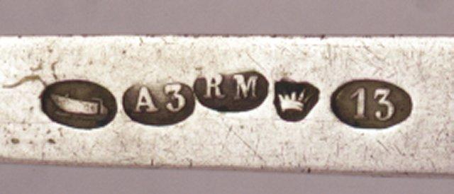 | huomiot | Osan tekniikka: metallityö; Nimi: Tutti; Leima: A3; RM; 13; Osan Pintamateriaali / käsittely: kultaus; Tyyli: uusrokokoo; Koristelu: kartussimainen lehtikoriste; Merkintätekniikka: kaiverrus; Osa: pesä |