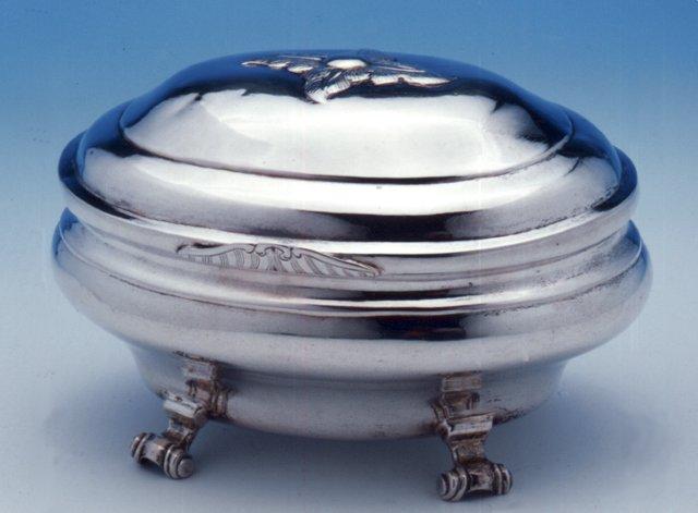 Ovaali, portaittain nouseva. Portaittain nousevan kannen keskuskoristeena pakotettu lehtiornamentti. Neljä kaksihaaraista valettua voluuttijalkaa. Kansi kiinnittyy saranalla runkoon. Kannen avaaja rocaille-koristeinen.