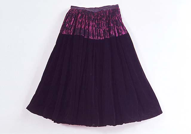 Mustaa samettia, yläosa 20 cm viotetinpunaista duchessia, joka on peitetty kukkakuviollisella mustalla pitsillä. Hame on vuorattu mustalla puuvillakankaalla, josta myös vyötärönauha on tehty. Kiinnittimenä vyötäröllä on kaksi vihreällä kankaalla päällystettyä nappia.