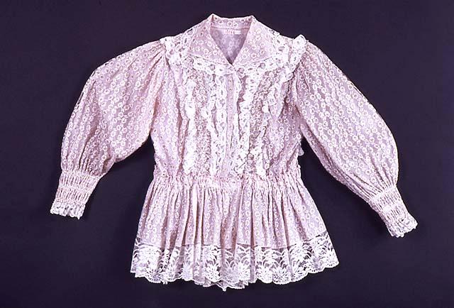 Päällyskangas valkoista nailonpitsiä, jossa kullalla koristettuja kukkakuvioita, alikangas vaaleanpunaista silkkitrikoota. Etumusta, kaulusta, helmaa ja selkäosaa reunustaa valkoinen rypytetty nailonpitsi. Runsaasti laskostettu helmaosa on eri kappaletta. Puserossa on ranteesta ja olkapäältä rypytetyt pitkät hihat. Pusero suljetaan edestä kuudella painonapilla (nepparilla).