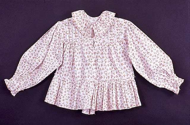 Valkopohjaisesta, pikkukukallisesta kankaasta valmistettu röijy. Kaulus on suora kaitale, poimuttamalla kiinnitetty, edestä painonapeilla kiinnitettävä. Kaarroke keskeltä edestä 10 cm korkea, siinä molemmilla puolilla 6 kpl 7mm laskoksia. Miehusta on väljä, vyötäröön asti ulottuva, poimuttamalla kaarrokkeeseen kiinnitetty. Takakappale istuva, kaartuu vyötäröllä keskeltä alas v-muotoisesti. Siitä 5 cm:n korkeudella on 5 cm:n levyinen röyhelö. Helmaosa on suora kaitale, joka on koko pituudelta runsaasti poimuttaen kiinnitetty vyötärölle. Hihat ovat pitkät, väljät, käden läpi menevään rannekkeeseen poimuttamalla kiinnitetyt, rannekkeen reunassa on 4 cm leveä röyhelö.