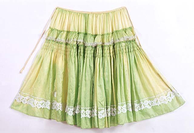 Vihreää kiiltäväpintaista nailonkangasta, nailonsatiinia, jonka nurja puoli on himmeä. Vyötärölle poimutetussa kappaleessa on röyhelö, jonka reunassa nailonpitsi. Pitsi on valkoinen ja siinä on hopeakiiltoa. Helmaosan yläreunassa on 4 kuminauhatikkausta 2,5 cm:n välein. Helmasta noin 15 cm:n korkeudella on valkoinen nailonpitis, ei poimuilla. Vyötärönauha pitkine solmunauhoineen keltaista silkkiä.