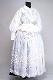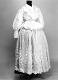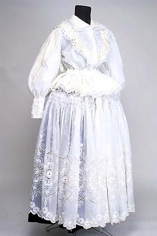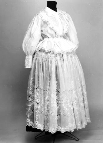 Kangas on valkoista himmeäpintaista silkkiä, joka on koristettu valkoisin paljetein. Paljetit on ommeltu vierekkäisiin polvekeriveihin, koko pintaa peittäen. Kääntyvän leveäkulmaisen kauluksen pinta on paljetein koristeltu, reunassa nylonpitsi. Etu- ja takaröyhelöitä varten on tehty 6 cm leveää paljettinauhaa, joka on kiinnitetty 2,5 cm leveällä nylonpitsillä poimuttaen. Reunassa on samaa pitsiä. Helmaa varten on 9 cm leveää paljettinauhaa, jonka molemmin puolin on nylonpitsi, pituus 280 cm. Paljettinauha on kiinnitetty 20 cm leveän helmakankaan päälle, sen alareunaan. Kiinteän selkäkappaleen pinta on kokonaan paljettia, alhaalla V-muotoinen. Selkä vuoritettu samalla kankaalla. Keskietu on painonapein kiinnitettävä ja sen kahden puolen on 2,5 cm leveä pitsi helman kiinnitykseen asti. Helman kiinnityspoimulangat ovat n. 3 cm:n välein. Etukappaleiden vyötärölle on pujotettu kuminauhoja. Hihat pitkät ja väljät, olalta poimutetut. Hihan päällä on olalta alkaen 47 cm pitkä kyynärpään alle ulottuva, ylhäältä n. 25 cm leveä alas suippeneva paljettipinta, joka on reunustettu pitsein ja kiinnitetty hihakankaan päälle. Hihan suissa on n. 15 cm pitkä joustava ranneke, neljällä pujotetulla kuminauhalla aikaansaatu.