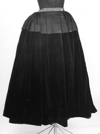 Nykyaikaiseen arkiasuun kuuluva hame, mustaa samettia. Vuori mustaa puuvillasatiinia, ommeltu helmaan kiinni, samoin ylhäällä 6 cm vyötäröltä alaspäin. Hameen yläosassa on 20 cm ohutta mustaa villasorsettia ja siinä on liitoskohdan yli ulottuva 8 cm leveä poikkilaskos. Edessä keskellä n. 25 cm halkion kohdalla on syvät litteät laskokset, kaksi molemmin puolin. Muu ympärys on 2 cm syvillä, vyötäröön vieri viereen kiinnitetyillä pystylaskoksilla.