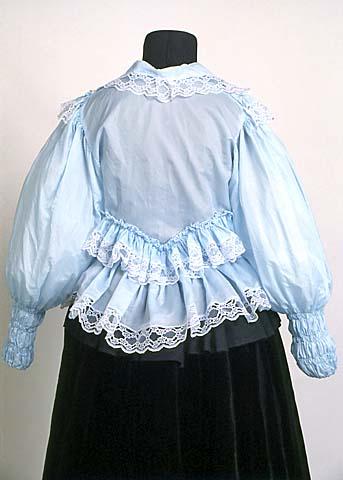 Vaaleansininen. Valkoista 5 cm leveää nylonpitsiä on sekä kauluksen reunassa, etuhalkion reunassa kahden puolen, olalta pyöreästi eteen kiinnitetyn 4 cm leveän röyhelön reunassa, vyötärölle taakse V-muotoisesti kiinnitetyn 4 cm leveän röyhelön reunassa ja 16 cm leveän pitkän suorakaiteen muotoisen helmakappaleen reunassa. Röyhelöiden ja helman kiinnitys on tehty 2-rivisesti poimuttaen siten, että siksakaten päärmätty reuna jää röyhelöksi päälle. Keskietu kiinnitetään painonapeilla. Etukappaleissa on kuminauha vyötäröllä. Takakappale on vyötäröltä istuva, kaartuu V-muotoisesti alas. Hiha on pitkä ja väljä, olalta poimutettu. Rannekkeena kolme paria kumilankaompeleita, pituus 15 cm. Suun päärmeeseen on pujotettu kuminauha.