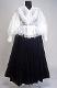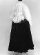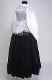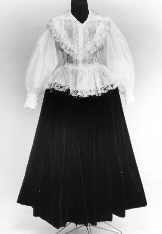 Kangas valkoista, hyvin kiiltävää, ohutta nylonsatiinia. Valkoista 4 cm leveää nylonpitsiä on leveäkulmaisen kauluksen reunassa, jatkuen etuhalkion reunaan molemmin puolin, sekä olalta V-muotoisesti eteen kiinnitetyn 5 cm leveän röyhelön reunassa ja taakse vyötärölle V-muotoisesti kiinnitetyn 5 cm leveän röyhelön reunassa. Selkäkappale on alhaalla V-muotoinen. Helma on 17 cm leveä suorakaiteen muotoinen, pitkä, yläreunastaan kapeasti päärmätty ja kahdella poimuompeleella 1,5 cm välein kiinnitetty siten, että kapea poimuröyhelö jää päälle, alareunassa pitsi. Hihat pitkät ja väljät, olalta poimutetut. Hihansuun päärmeeseen on pujotettu kuminauha. Kumilankaompeleita on 3 cm:n välein aina 2 rinnakkain siten, että muodostuu joustava 13 cm pitkä ranneke. Keskietu on painonapein kiinnitettävä.