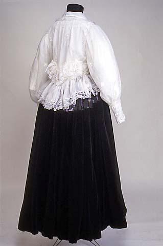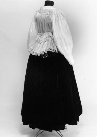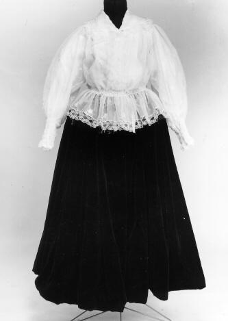 Kangas on valkoista läpinäkyvää nylonia ("ikkunaverhoa"), jossa on valkoisella puuvillalangalla tehtyä kevyttä kukka-aiheista koneommelkirjontaa. Valkoista 4 cm leveää nylonpitsiä on helmassa, leveäkulmaisen kauluksen reunassa jatkuen etuhalkion reunaan molemmin puolin. Keskietu on painonapeilla kiinnitettävä. Etukappaleissa on olalla laskosväljyyttä ja vyötäröllä kuminauhat. Selkäkappale on alhaalla V-muotoinen ja sen yläpuolella samaan muotoon kiinnitetty 5,5 cm leveä röyhelö nylonpitseineen. Helma on 16 cm leveä suorakaiteen muotoinen yläreunastaan kapeasti siksakilla päärmätty ja kahdella kumilangalla poimutettu ja kiinnitetty siten, että poimutus jää päälle kuten röyhelössäkin. Hihat ovat pitkät ja väljät, olalta poimutetut. Hihansuun päärmeeseen on pujotettu kuminauha ja 13 cm:n pituudelta siinä on 2,5 cm:n välein ommellut kumilangat, yhteensä 5 kappaletta. Näin on muodostunut joustava ranneke.