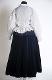 Himmeäpintaista ohutta valkoista keinosilkkiä, jossa mustat pallokuviot. Kääntyvä kaulus, joka on takaa 7 cm leveä, edestä leveäkulmainen. Keskietu painonapeilla kiinnitettävä, nousee lähelle kaulaa. Keskiolalta eteen on kaarrokemaisesti kiinnitetty 6 cm leveä kangasröyhelö, samoin takana V-muotoinen vyötärön yläpuolella. Edessä vyötäröllä kuminauhat. Helma on 16 cm leveä suorakaiteen muotoinen kaitale yläreunastaan kapeasti siksakaten päärmätty ja runsaasti poimuttaen kiinnitetty kahdella tikillä 1,5 cm välein siten, että reunapoimutelma jää päälle. Hihat pitkät ja väljät, olalta poimutetut. Joustava 12 cm pitkä ranneke on tehty neljällä pujotetulla kuminauhalla. Hihansuu on kokonaan kaksinkertainen. Siihen on ommeltu kuminauhakujat.