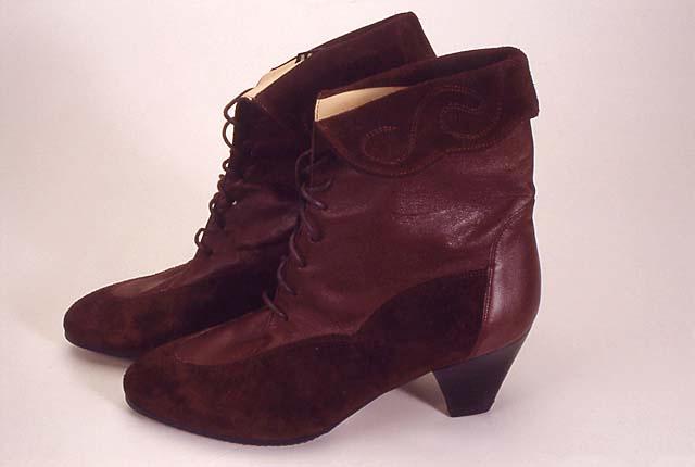 Uudet, käyttämättömät. Viininpunaiset nahnilkkurit, jorka sidotaan edestä nauhoilla. Varren reuna aaltoileva, käännettävä, siinä aaltotikkauskuviointia. Nilkkurien varsi, kantapää ja etuläppä nahkaa, muu osa samanväristä mokkaa. Vuori kellertävää keinonahkaa. Korko kiilamainen, pohjassa rosoinen muovipohja.