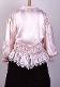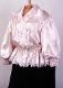 Vaaleanpunaista keinosilkkiä. Valkoinen 4 cm leveä pitsi reunustaa pienikulmaista kaulusta, helmaa ja etuhalkiota. Lisäksi takana vyötäröllä on V-muotoisen helmakiinnityksen yläpuolella samaan muotoon kiinnitetty pitsireunainen röyhelö. Röijyn etumuksessa on pitsikaarrokkeet ja hihoihin päälleommeltuina V-muotoiset pitsinauhat. Helma muodostuu kahdesta 13 cm leveästä suorakaiteen muotoisesta kaitaleesta. Liitossauma takana keskellä. Helman kiinnitys takaa V-mallinen. Helmakaitale on yläreunastaan siksakaten kapeasti päärmätty ja 2 cm välein poimuompeleella kiinnitetty siten, että kapea poimutusreuna jää päälle röyhelöksi. Poimuompeleiden väliin jäävään kujaan on etumuksessa pujotettu kuminauha. Helman alareunassa pitsi. Hihat ovat pitkät ja väljät, olalta poimutetut. Suun päärmeeseen on pujotettu kuminauha. Kumilankaompeleita on 2,2 cm välein aina 2 rinnakkain siten, että muodostuu joustava 15 cm pitkä ranneke. Hihojen päälle on ommeltu pitsinauhaa siten, että hihansivuilta molemmin puolin alkavat nauhat yhtyvät hihan päällä muodostaen V-muodon. Röijyn etuhalkio on painonapein kiinnitettävä. Röijyn etumuksen yläosa 1 cm - 1,5 cm välein hiuslaskostettu. Laskostetun osan alareunassa pitsikaarroke.