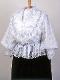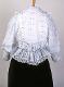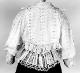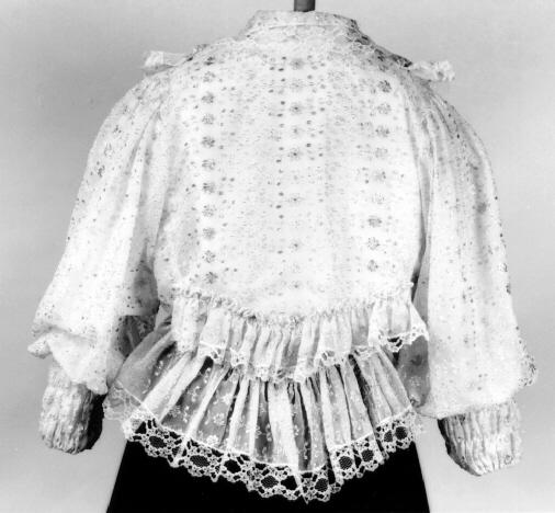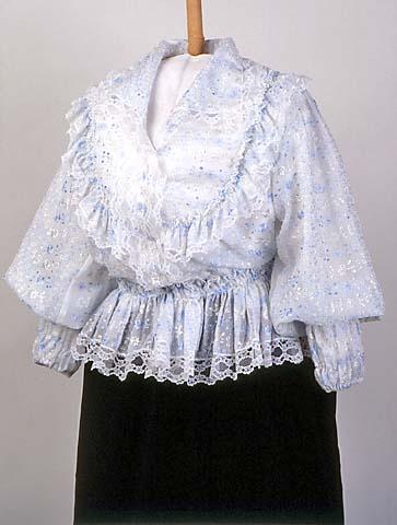 Valkopohjaista, läpinäkyvää, sifongin kaltaista kangasta, jonka pinta on kauttaaltaan vaaleansinisellä ja hopealangalla tehtyjen kukkakuvioiden koristama. Valkoinen 3,5 cm - 4 cm leveä pitsi reunustaa kaulusta, helmaa ja etuhalkiota sekä olalta V-muotoisesti eteen kiinnitetyn 6 cm leveän röyhelön reunaa. Lisäksi takana vyötäröllä on V-muotoisen helmakiinnityksen yläpuolella samaan muotoon kiinnitetty pitsireunainen röyhelö. Helma muodostuu kolmesta 14 cm leveästä, suorakaiteen muotoisesta kaitaleesta, liitossaumat sivuilla. Helman kiinnitys takaa V-mallinen. Helmakaitale on yläreunastaan siksakaten kapeasti päärmätty ja 2 cm välein poimuompeleella kiinnitetty siten, että kapea poimureuna jää päälle röyhelöksi. Poimuompeleiden väliin jäävään kujaan on etumuksessa pujotettu kuminauha. Helman alareunassa pitsi. Hihat ovat pitkät ja väljät, olalta poimutetut. Suun päärmeeseen on pujotettu kuminauha. Kumilankaompeleita on 4 cm välein siten, että muodostuu 16 cm pitkä joustava ranneke. Röijyn etuhalkio on painonapein kiinnitettävä. Olalta eteen kaartuvat röyhelöt yhdistyvät n. 15 cm helman kiinnitysreunan yläpuolella.