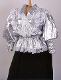 Hopenväristä kiiltävää lamékangasta. Valkoinen 5 cm leveä pitsi reunustaa kaulusta, helmaa ja etuhalkiota sekä olalta V-muotoisesti eteen kiinnitetyn 5 cm leveän röyhelön reunaa. Lisäksi takana vyötäröllä on V-muotoisen helmakiinnityksen yläpuolella samaan muotoon kiinnitetty pitsireunainen röyhelö. Helma muodostuu kahdesta 15 cm leveästä suorakaiteen muotoisesta kaitaleesta, liitossauma takana keskellä. Helman kiinnitys takaa V-muotoinen. Helmakaitale on yläreunastaan päärmätty ja 2 cm välein poimuompeleella kiinnitetty siten, että kapea poimutusreuna jää päälle röyhelöksi. Poimuompeleiden väliin jäävään kujaan on etumuksessa pujotettu kuminauha. Helman alareunassa pitsi. Hihat ovat pitkät ja väljät, olalta poimutetut. Suun päärmeeseen on pujotettu kuminauha. Kumilankaompeleita on 3 cm välein aina 2 rinnakkain siten, että muodostuu 20 cm pitkä joustava ranneke. Röijyn etuhalkio on painonapein kiinnitettävä. Olalta eteen kaartuvat pitsireunaiset röyhelöt yhdistyvät 15 cm helman kiinnitysreunan yläpuolella.