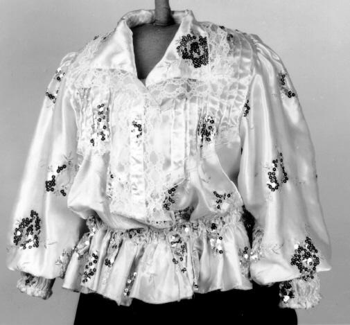 Valkoista keinosilkkiä, jossa hopealangoin kirjottuja lehtikuvioita ja hopeanväristen paljettien ryhmiä. Valkoinen 3,5 cm - 4 cm leveä aaltoreunainen pitsi reunustaa kaulusta ja etuhalkiota. Lisäksi röijyn etumuksessa on samasta pitsistä puolitettuna tehdyt kaarrokkeet. Helma muodostuu yhdestä pitkästä, suorakaiteen muotoisesta, 15 cm leveästä kaitaleesta. Helman kiinnitys takana V-mallinen. Helmakaitaleen yläreuna on kapeasti päärmätty ja 2 cm välein poimuompeleella kiinnitetty siten, että kapea poimureuna jää päälle röyhelöksi. Poimuompeleiden väliin jäävään kujaan on etumuksessa pujotettu kuminauha. Takana vyötäröllä on V-muotoisen helmakiinnityksen yläpuolella samaan muotoon poimuompeleella kiinnitetty röyhelö. 6 cm - 7,5 cm leveä röyhelö tehty samasta kankaasta, aaltomaiseksi leikattua röyhelön alareunaa reunustaa hopeanvärisellä langalla tehty 0,5 cm leveä kanttaus. Hihat ovat pitkät ja väljät, olalta poimutetut. Suun päärmeeseen on pujotettu kuminauha. Kumilankaompeleita on 2,5 cm välein aina 2 rinnakkain siten, että muodostuu 11 cm pitkä joustava ranneke. Röijyn etuhalkio on painonapein kiinnitettävä. Etumuksen yläosa on 1,5 cm välein hiuslaskostettu. Laskostetun osan alareunassa puolitetusta pitsistä tehty kaarroke.