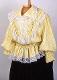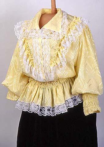 Keltaista, pinnaltaan hieman ryppyistä tekokuitukangasta. Kankaassa kiiltolangalla tehtyjä teräväkärkisiä, heinämäisiä kuvioita. Valkoinen 5 cm leveä nylonpitsi reunustaa kaulusta, helmaa ja etuhalkiota sekä olalta V-muotoisesti eteen kiinnitetyn 4,5 cm leveän röyhelön reunaa. Lisäksi takana vyötäröllä on V-muotoisen helmakiinnityksen yläpuolella samaan muotoon kiinnitetty pitsireunainen röyhelö. Helma muodostuu kolmesta 14,5 cm leveästä suorakaiteen muotoisesta kaitaleesta, liitossaumat sivuilla. Helman kiinnitys takaa V-mallinen. Helmakaitale on yläreunastaan siksakaten kapeasti päärmätty ja 2 cm välein poimuompeleella kiinnitetty siten, että kapea poimutusreuna jää päälle röyhelöksi. Poimuompeleiden väliin jäävään kujaan on etumuksen sivuilla pujotettu kuminauha. Helman alareunassa pitsi. Hihat ovat pitkät ja väljät, olalta poimutetut. Suun päärmeeseen on pujotettu kuminauha. Kumilankaompeleita on 3 cm välein aina 2 rinnakkain siten, että muodostuu joustava 19 cm pitkä ranneke. Röijyn etuhalkio on painonapein kiinnitettävä.